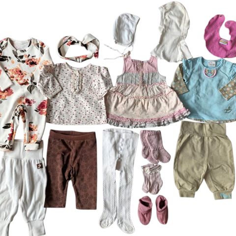 Kuvissa on esimerkkejä laatikon sisällöstä. Vaatteet ovat noin koossa 50-70 cm, poika/unisex.
