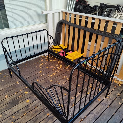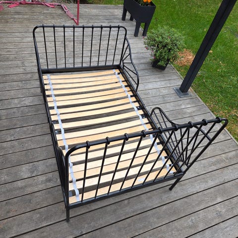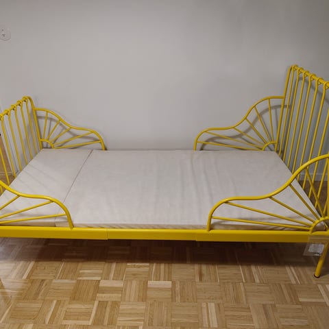 IKEAn kolmeen eri pituuteen säädettävä sänky. Runko metallia, ihana harvinaisempi keltainen väri. Sänky on aivan ehjä. Ei satu silmään mitään liimatuhruja tai kolhuja.