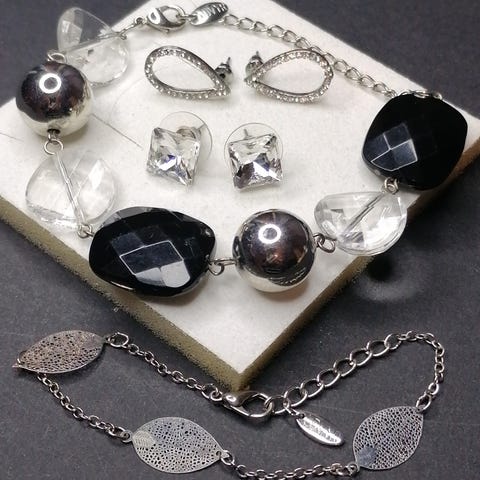 Leveä rannekoru ja pitkät korvikset kristallia