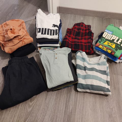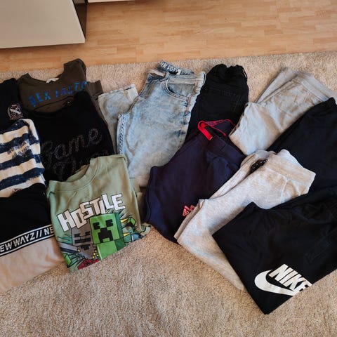 Paketissa 1 huppari, 2 housut, 2 kalsarit, 2 kolitsipaitaa, 4 t-paitaa. Nouto Leppävaarasta.