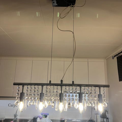 Riippuvalaisin, jossa on metallirunko ja kristallikoristeet. Valaisin on suunniteltu kattoon ripustettavaksi ja sisältää useita pyöreitä metalliosia sekä useita kristallipalasia, jotka luovat koristeellisen ja valoa heijastavan efektin. Sopii sisätiloihin, joissa halutaan yhdistää klassinen ja koristeellinen valaistusratkaisu.Kaksijohtoinen joko sokerinpala tai valopistoke