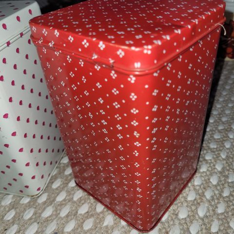 Marimekko Muija Peltipurkki. Valkoinen (beige), saranoidulla kannella, korkeampi malli, Korkeus n. 18,5 cm. Muija-kuosin on suunnitellut Maija Isola v. 1968.
