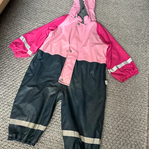 Sinapinkeltaiset vuorettomat henkselikurahousut, vaaleanpunainen valaskuvioinen vuoreton sadetakki sekä eläinkuvioiset vuorettomat kurarukkaset. Takki ja housut koossa 80 cm, rukkaset koossa 1. Ei reikiä, mutta vähän tahraa voi olla. Ihan siisti käyttökunto. Jalkalenksuissa rispaumaa. Nämä voi vaihtaa.