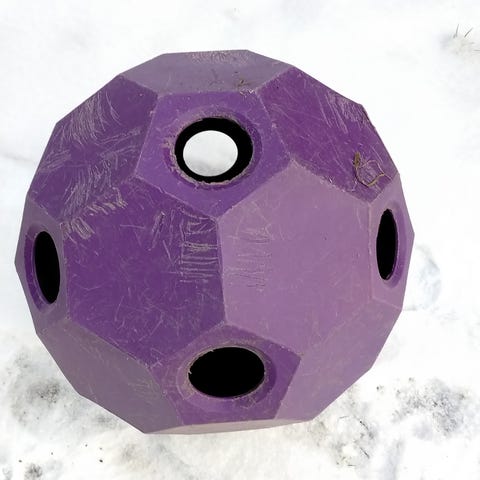 Hööksistä ostettu leikki/heinäpallo (89,90€). Meillä ei arvostettu tätä ja pallo sai kaviosta kolhun (näkyy kuvassa).