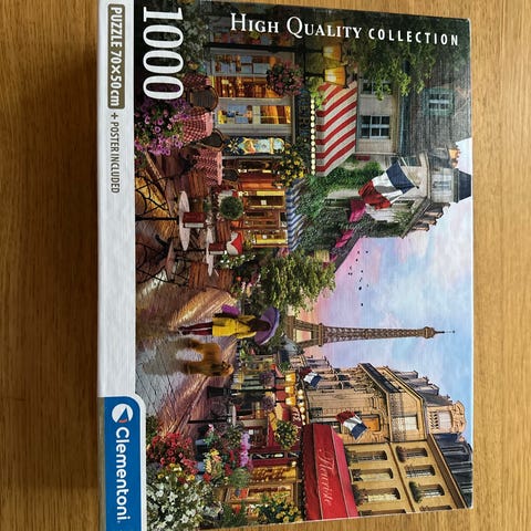 Clementoni Paris-teemainen 1000 palan palapeli, jossa on kuva Pariisin kadusta Eiffel-tornin taustalla.