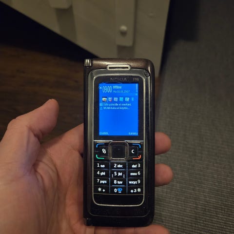 Kuvan puhelin. Joitakin vuosia kaapissa ollut. Lähtee päälle, pitäisi olla toimiva. Tehdas asetuksilla. Ei takuuta.