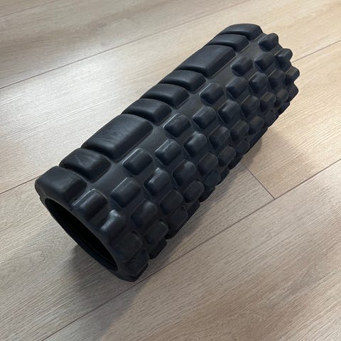Foam Roller hierontarulla mustalla muovipinnalla. Käytetään lihasten rentouttamiseen ja hierontaan. Sopii erilaisiin harjoitus- ja palautumistarpeisiin.