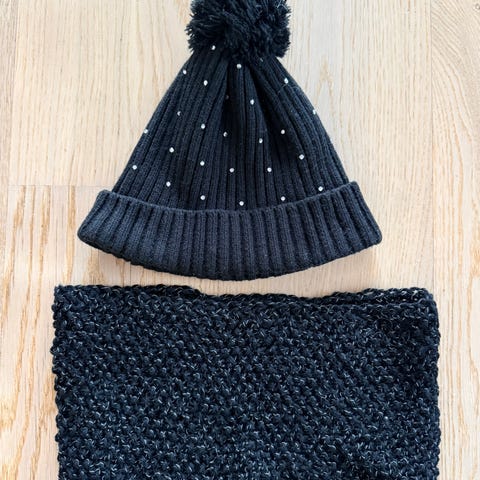 Ehjä Bogin trikoopipo ja siihen puuvilla langasta tehti kietaisu kaulahuivi. Pipon ympärys 48cm. Myynnissä Marjalassa.