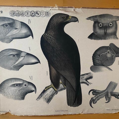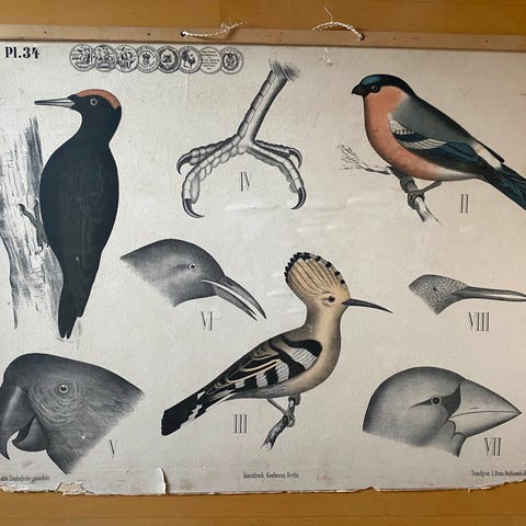 Wanha saksalainen opetustaulu Mustalintu (?) on kooltaan 62 x 79 cm. Reunoissa rikkoa, varsinkin kulmissa.