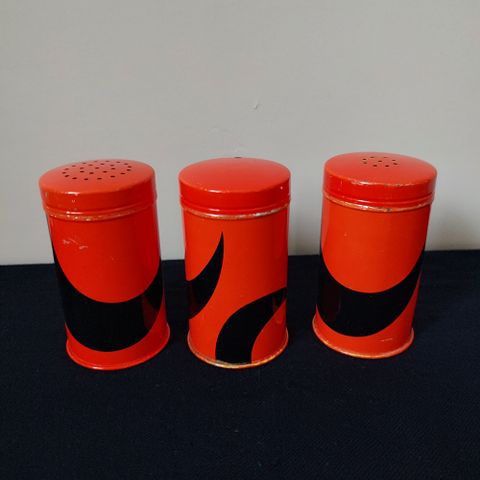 Aarikka säilytysastia, jossa on punavalkoinen raidallinen design. Materiaalina metalli. Vintage. 1 kpl 10 eurolla, molemmat yhteishintaan 2