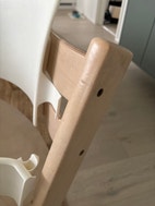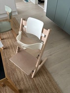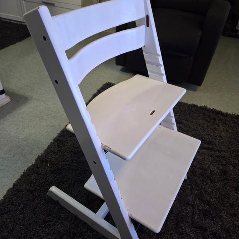 Elämää nähnyt tuoli, lommoja kauttaaltaan, mutta silti yleisilme siisti, mukaan osat, joilla tuolista saa syöttötuolin