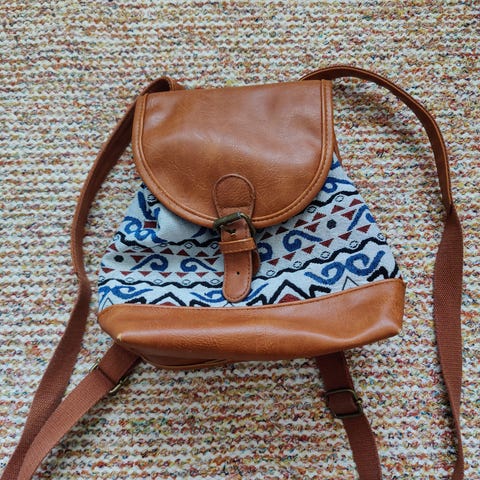 Uudenveroinen, keinonahkainen pikkureppu. Korkeus 15 cm, leveys noin 16 cm ja syvyys noin 10 cm.
