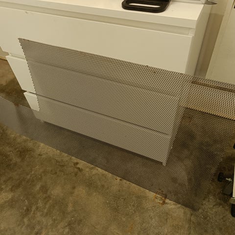 Käytetty muovitettu teräsverkko 150 cm x n. 20 m. Silmäkoko 100 x 50 mm. Muutamassa kohdassa poikkinaisia lankoja, ei varsinaisia reikiä.