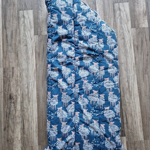 Familonin valmistama hyväkuntoinen makuupussi vetoketjulla, muhkea ja lämmin. Pesty hajusteettomalla pesuaineella.