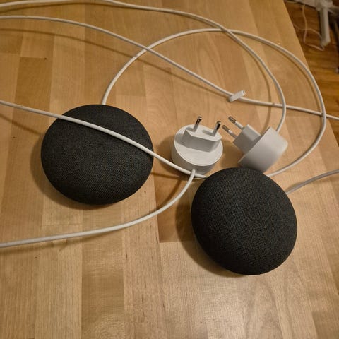Google Nest Mini älykaiutin, harmaa väri, pyöreä muotoilu, kangaspäällysteinen pinta. Soveltuu ääniohjaukseen ja älykodin hallintaan.