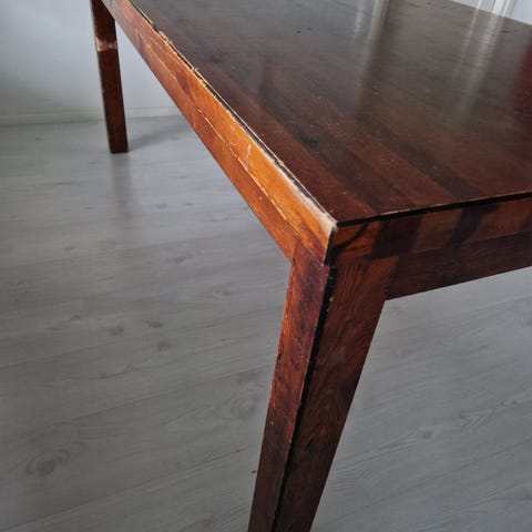 Antiikkityylinen täystamminen (painava) ruokapöytä, jossa on laajennettavia jatkopaljoja 2 (145cm + 62cm + 62cm). Pöydän jalat ovat veistetyt ja siinä on koristeellisina kohtina leijonantassut. Pöytä vaatii kunnostusta, vaan nikkarin käsissä tulee näyttävä ja edustava pöytä isompiikiin pitoihin.