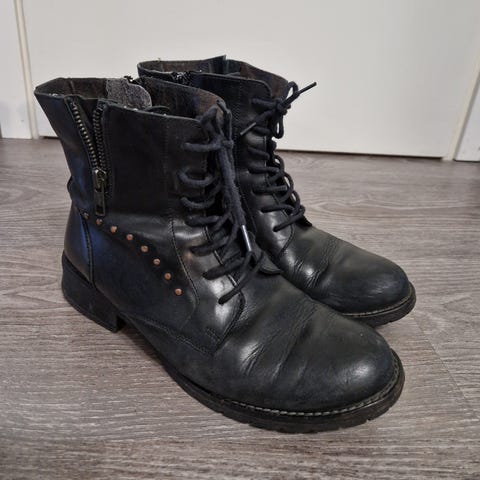Nahkaiset strangen kengät ysärityyliin. Painavat, kunnon kumipohjat. Ehjät, mutta kuluneet. Koko 38 ja väri vaaleanruskea/tummanruskea.