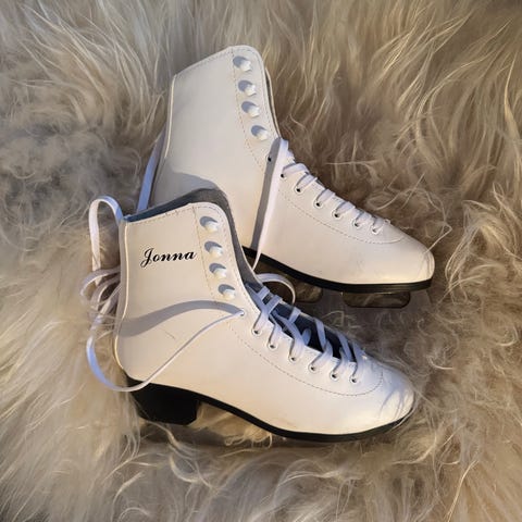 JOFA luistimet, koko 38, valkoinen väri. Soveltuvat muuhun luisteluun. Nahkamateriaali ja perinteinen nauhakiinnitys. Käytetty kunto.