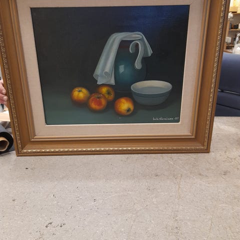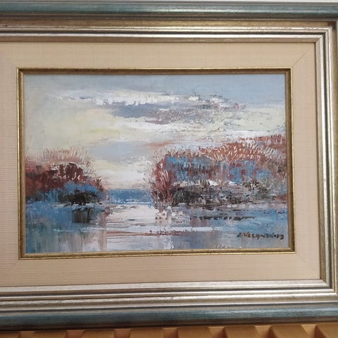 Eero Karjalainen öljymaalaus vuodelta 1994, Lukeva poika. Teoksen koko on 52x76 cm. Maalaus on kehystetty ja siinä on taustalapussa tekijän tiedot ja yhteystiedot.