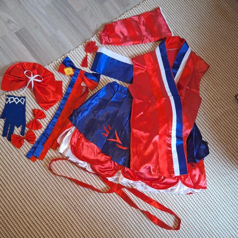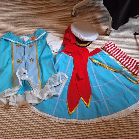 Asuun kuuluu paita, hame ja hiuspanta. Asu on itse tehty monta vuotta sitten, joten asu ei ole kaikista parhainta ompelujälkeä.