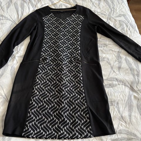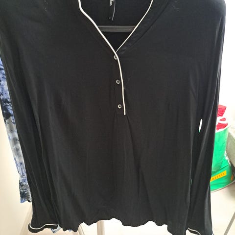 Ciso style your curves - paita, musta pohjaväri. Joustavaa viskoosia. Kokolapussa 46, mutta mielestäni enemmän 48. Kainalo-kainalo n. 62 cm, olka-helma n. 80 cm. 2/3-hihat. Napit edessä. Pyöristetty helma.