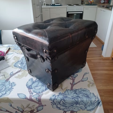 Musta matka-arkku. Mitat 84x49x31cm. Ehjä. Lukon avain puuttuu. Säilytetty lämpimässä varastossa. Kuvissa arkku pölyinen.