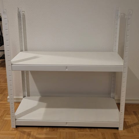 Myydään metallinen varastohylly; korkeus 200, hyllylevyt 90×40.