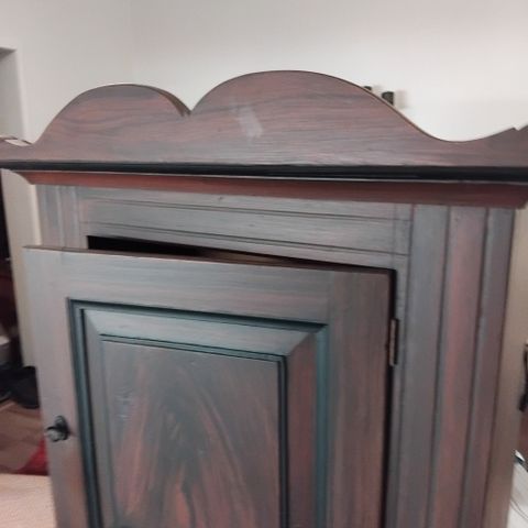 Vanha renginkaappi, nurkkaan sijoitettava, kuultavan valkoinen. Ovessa lukko, avainta ei ole.