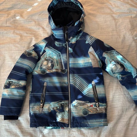Molo lasten takki koossa 116, unisex-malli. Takissa on kirjava väritys ja vetoketju- sekä nepparikiinnitys edessä. Takissa on huppu. Pieni tarha edessä (kuva). Vetoketjusta lähtenyt osa irti (kuva), joten vaatisi korjauksen.
