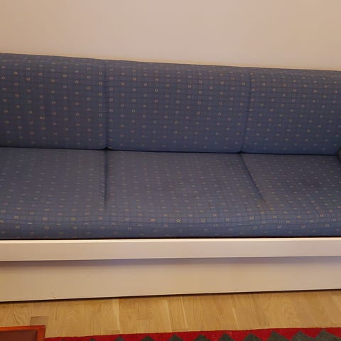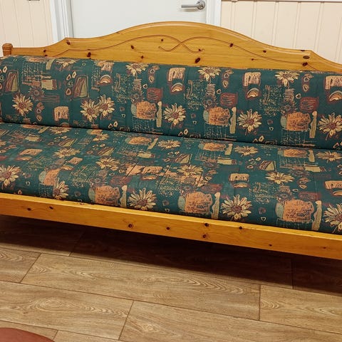 Vuodesohva puinen pehmusteilla ja vuodevaatelaatikolla. Todella kätevä ja hyvä kuntoinen.