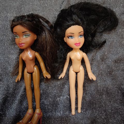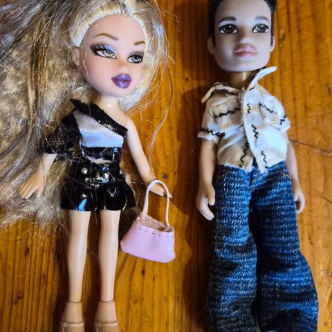 Kaksi pientä Bratz-nukkea, olivatkohan Li'l Bratz-merkkiset. Molemmilla vaatteet ja kengät, tytöllä myös laukku. Nämä melko sopivat asumaan myös nukkekodissa.