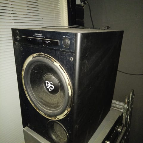 B&W Acoustitune, vanha toimiva peli. Joku on lisännyt aikanaan pyörät alle ja 'komean' logon kylkeen. Irrallinen refleksiputki puuttuu.