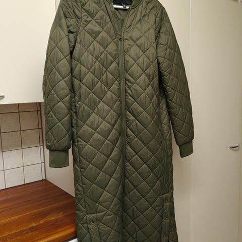 H&M pitkä naisten tikkitakki koko S, musta väri. Takki on valmistettu 100 % polyesterista, sisältäen toppauksen ja vuorin polyesterikankaasta. Sivuissa halkiot. Väljä malli. Mitta kainalosta kainaloon n. 56 cm ja olka-helma takana n. 108 cm. Siistikuntoinen, ei kulumia tms.
