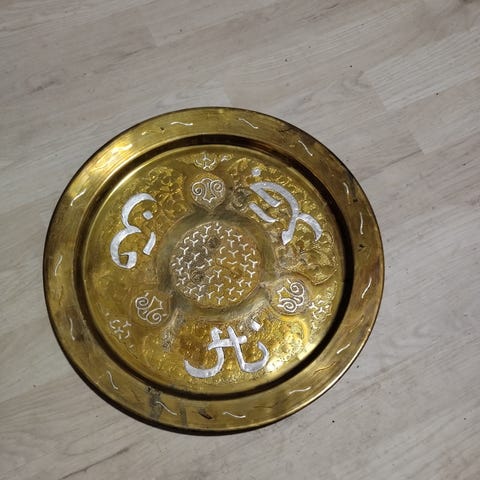 Vanha maasta kaivettu messinkinen avainkilpi.