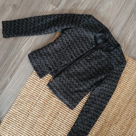 Myydään hyväkuntoinen musta Safran jakku.Ka-ka 47cm ja olkapäältä alas helmaan 52cm.Materiaalina 54%puuvillaa,polyesteriä 43% ja 3% Elastaania.Jakussa isohkot napit.