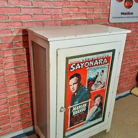 Vanha kaappi. Korkeus korkeimmasta kohdasta noin 98.5, leveys 86 ja syvyys 33 cm. Kunnostettu noin 20 vuotta sitten ja maalattu sillon pellavaöljymaalilla. Vetimet puuttuu.