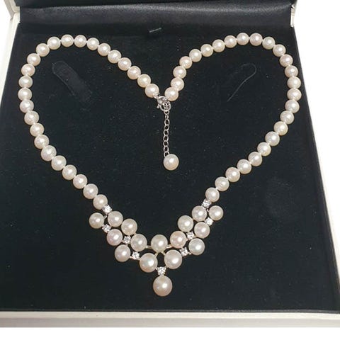Mallorcan helmikoru. Pituus 44cm. Helmet tehty opalino- nimisestä puhalletusta erikoislasista.