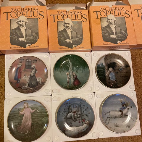 Zacharias Topelius seinälautaset, 4 kappaletta, valmistettu keramiikasta. Lautaset ovat koristeltuja erilaisilla kuvituksilla, jotka liittyvät Topeliuksen runouteen. Lautasten halkaisija on noin 14 cm. Sopivat seinäkoristeeksi tai keräilyesineiksi.