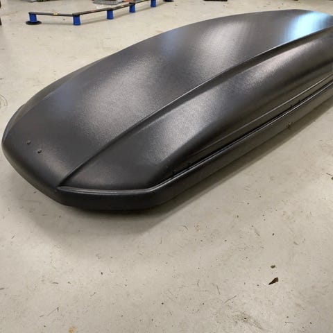 Musta matala ja leveä suksiboxi. Kattotelineet mukaan. Telinekiinnitys kattokiskoihin. Käytönjälkiä on. Mitat: pituus 215 cm, leveys 100 cm ja korkeus 20 cm