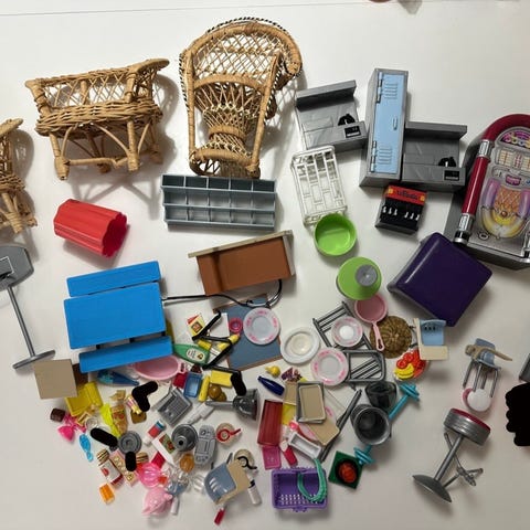 Sekalaisia Bratz nuken tarvikkeita. Punaiset saappaat taitaa olla Barbie nuken.