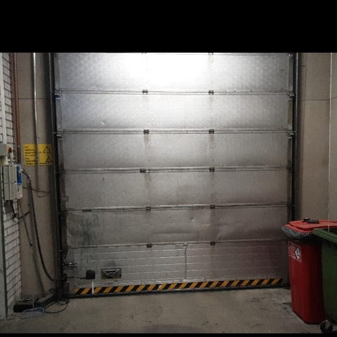 Käytetty alumiininen nosto-ovi.Käytön jälkeä on ja alimmainen elementti päästä hiukan taipunut mutta helposti vielä oikastavissa.Kahdessa keski elementissä ikkunat.Koko leveys 3.8m korkeus 4,5m.