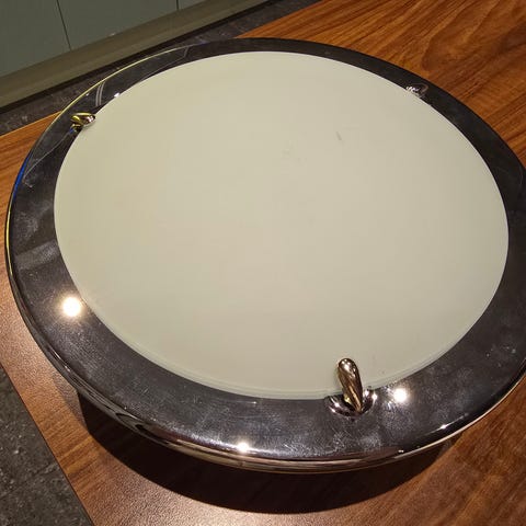 Ollut kullattuna sisältä- yritetty maalata valkoiseksi. Muuten hyvä valaisin/runko projektille.