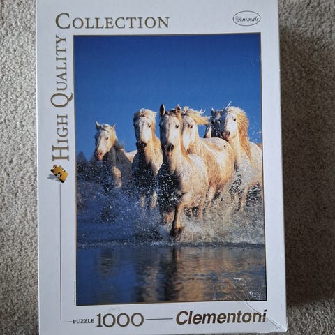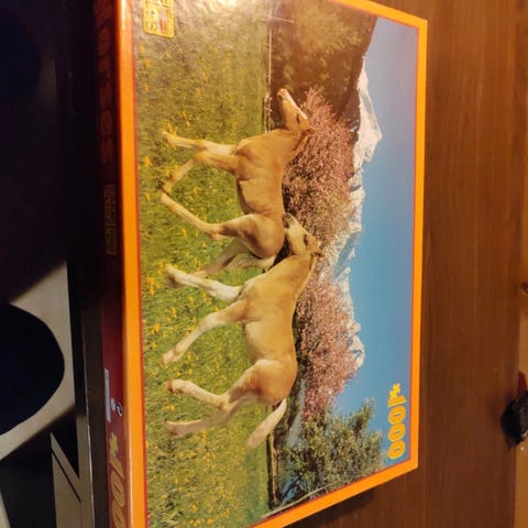 Kuvanmukainen hevosaiheinen palapeli, jossa 1000 palaa. Palapeli on vanha ja monta kertaa koottu. Joissakin paloissa on kulumaa esim. pintaa kulunut tai alkanut hieman reunoista irtoamaan (kuvattu). Nämä pintavauriot eivät vaikuta kokoamiseen.