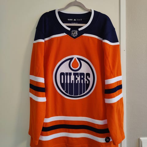 Myydään kuvienmukainen Oilers -pelipaita. Oikean olkapään kohdalla kaksi pientä reikää. Muuten paita on ihan hyvässä kunnossa.