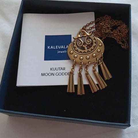 Taigakorusta ostettu Kalevalan Kuu-kaulakoru. Ei tullut mulla sittenkään käyttöön, joten ihan uusi ja käyttämätön, oikeastaan aina tässä rasiassaan ollut. Myyn 50€ ketjun kanssa ja 35€ pelkkä riipus.