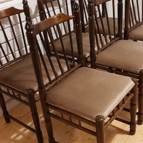 Kaksi vaaleaa puista ruokatuolia, joissa on puuvillaverhoillut istuimet. Lakattu vaalea puurunko. Selkänoja 1900-luvun puolivälin skandinaavista kaarevaa vaneria. Hyvässä kunnossa, normaaleja käytön jälkiä. Runko on hieman löysällä ja sen korjaamiseen voisi käyttää puuliimaa.