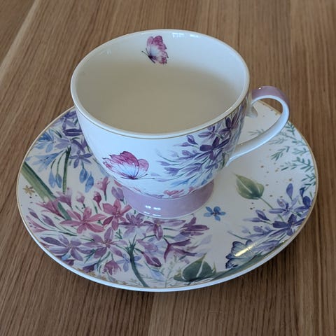 Kolmen valkoisen Burleigh England astian setti, jossa teekannu, lautanen ja kulho/sokerikko.