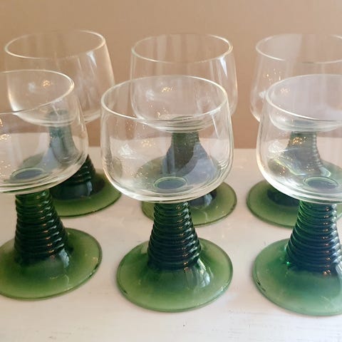 Kaksi punaviinilasia ja kolme valkoviinilasia. Hiottu kuvio lasin sivuilla. Virheettömät. Yhteishinta.