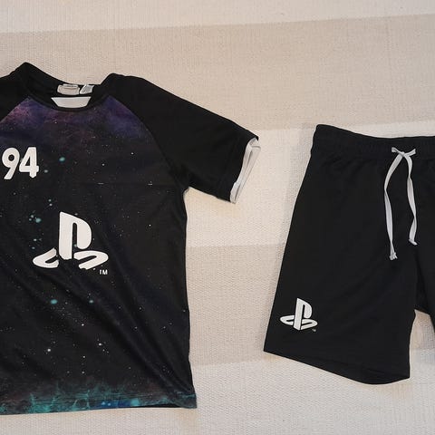 Musta t-paita, jossa edessä playstation- ohjaimen kuva sekä sinisen ja lilan sävyisiä roiskeita. Paita on takaa musta. Vähän pidetty, hyvässä kunnossa!