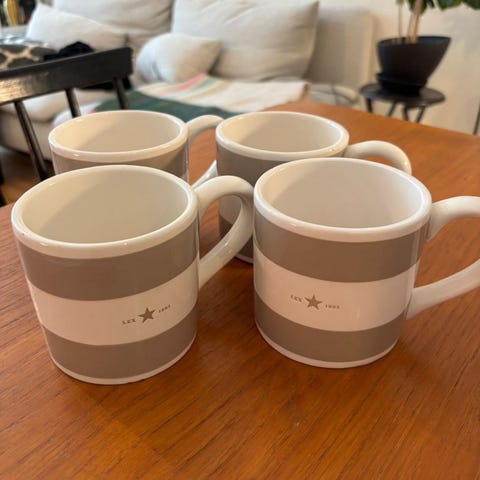 Lexington Company Dessert Plates lautaset, valkoinen pohjaväri punaisella reunuksella ja sinisellä tekstillä. Setti sisältää useita lautasia, jotka soveltuvat jälkiruokien tarjoiluun. Lautaset on valmistettu keraamisesta materiaalista. Joissakin lautasissa on käytön jälkiä, kuten pieniä naarmuja ja sirpaleita reunoissa.